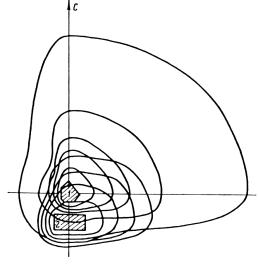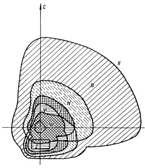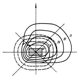 На план местности (см. рис. 2 и 3) наносятся границы источников загрязнения и зоны с различной СЗА, рассчитанные с учетом розы ветров. Затем рис. 2 и 3 накладываются один на другой (рис. 4) и определяется результирующая СЗА в соответствии с п.3.8 настоящей Инструкции (рис. 5). Если переход от одной зоны к другой получается больше чем на одну ступень СЗА, вводятся зоны с промежуточными значениями СЗА и окончательно принятые границы зон сглаживаются (рис. 6).