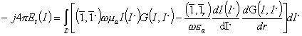 Вk (I¢) - кусочно-линейная базисная функция k-й моды. Поскольку ток и его производная являются суммами, интеграл в (3.4) заменяется суммой интегралов (число интегралов равно числу мод тока, т.е. N), причем каждый интеграл вычисляется по длине соответствующего сегмента, а каждый весовой коэффициент (как независящий от переменной интегрирования I¢) выносится за знак соответствующего интеграла. Подинтегральные функции больше не содержат неизвестных величин, поэтому интегралы могут быть вычислены. Уравнения вида (3.5), записанные для N точек сшивания образуют систему линейных уравнений относительно I1, I2, ¼ IN, которая в матричной записи имеет вид: