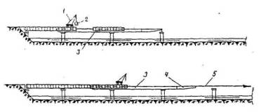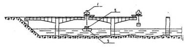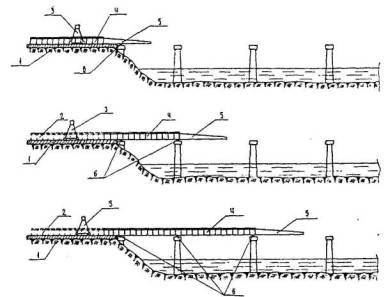 2.6. Разрезные балочные пролетные строения из предварительно собранных балок монтируют теми же способами, что и пролетные строения из цельнопролетных балок. Пролетные строения мостов других систем монтируют: навесным (рис. 1) или полунавесным способами, путем продольной надвижки (рис. 2), а также путем сборки на инвентарных передвижных (рис. 3) или стационарных подмостях.