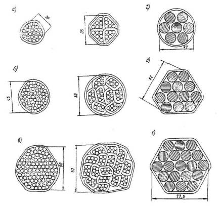 сечение пучков из проволок и прядей: