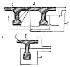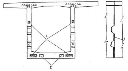 В конструкциях с нижней арматурой, расположенной в открытых каналах, часть блоков коробчатого сечения должна иметь в плите окна для подачи внутрь коробок бетона омоноличивания.