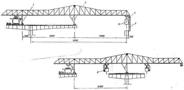 часть пролетного строения; 5-аванбек; 6-накаточные устройства